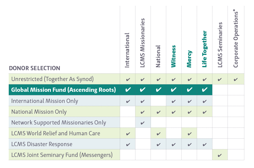 * Corporate synod operations includes areas such as LCMS Communications (news and information), accounting, auditing, information technologies, building operations, unfunded Synod Convention mandates, and program expenses and personnel where no other source of funding is available (including the Global Mission Fund).